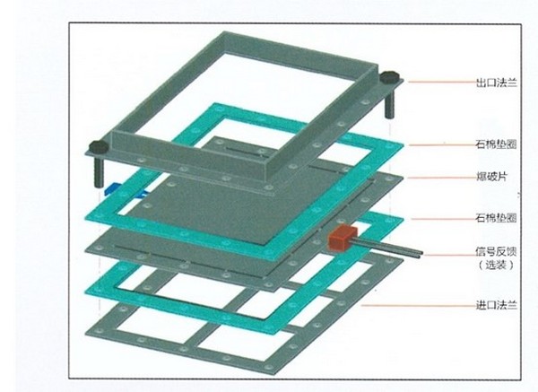 泄爆片為平板或者拱形樣式,由周邊透縫(或中心處)及相鄰終止孔間構成的減弱結構控制,爆破沿透縫撕裂形成泄放通道。當被保護設備超壓時,爆破片沿設計的縫隙和孔構成的薄弱結構拉伸破壞,泄放超壓介質,從而起到保護作用。具有泄壓面積大,密封性好、動作靈敏、安全可靠、爆破壓力低等優(yōu)點。